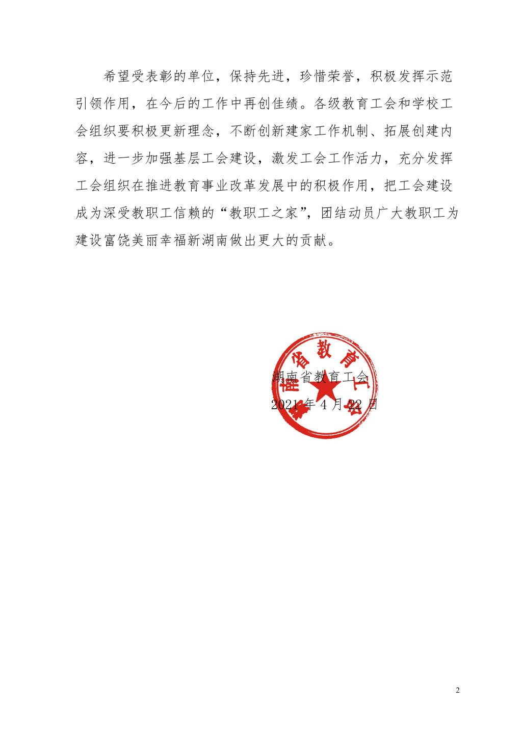 近日,湖南省教育工会发布《关于表彰2020年度湖南省模范教职工之家和湖南省模范教职工小家的决定》,我院获评“湖南省模范教职工小家”荣誉称号,标志我院工会工作取得新成效。
