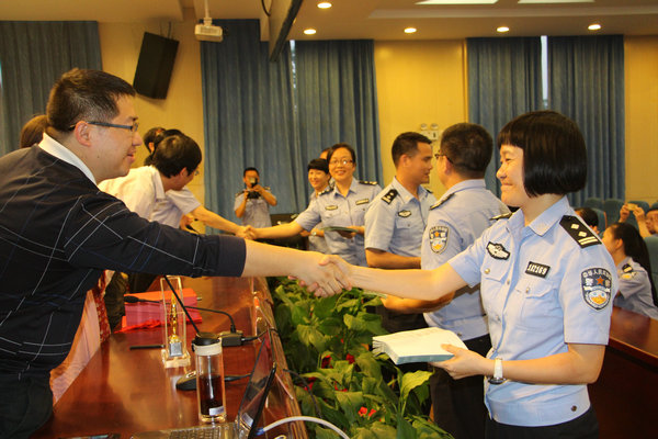 最后,杨波波将警徽赠予我院。在座老师亲自颁发学员的结业证书,各分局局长上台领取。为期十天的研修课程在此正式画上了句号。