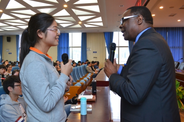 “大家好!”伴随一声不太流利的中文,一位黑人男子走上了讲座台,他就是麦克菲尔校长。讲座上,麦克菲尔校长谈论起了自己的家庭和成长经历,并向同学们表达了来自遥远大洋彼岸的友好和真诚。。