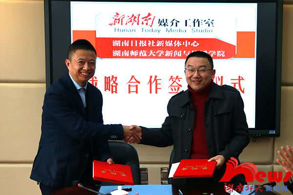 (记者 李瀚 胡明玥 张可唯)12月30日上午,“新湖南”媒介工作室挂牌暨战略合作签约仪式在我校太阳集团tyc151会议室举行,湖南日报总编辑、湖南日报社新媒体中心总编辑蒋祖烜,湖南日报编委、湖南日报社新媒体中心常务副总编辑颜斌,湖南日报社新媒体中心副总编辑文凤雏,我校校党委书记李民、校长蒋洪新等出席会议。签约仪式由新传院党委书记龚向明主持。