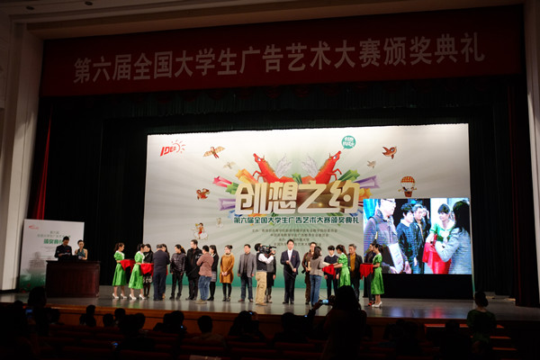 第六届全国大学生广告艺术大赛(大广赛)颁奖典礼日前在北京市全国政协礼堂隆重举行。教育部原副部长吴启迪出席颁奖典礼并致辞,来自全国各参赛院校的近千名师生代表参加了颁奖典礼。由我院广告系主任王战教授带队,校教务处罗明副处长及我院多名老师与获奖学生参加了本次颁奖典礼。在本届大广赛中,我院又一次刷新了获奖记录,共获一等奖1项,二等奖3项,三等奖5项及优秀奖9项的喜人成绩。特别值得一提的是,在评委点评环节中,大广赛资深评委胡川妮教授对我院一等奖作品——策划案《仰望》进行了重点推介,对我院参赛学生的专业素养予以高度肯定。
