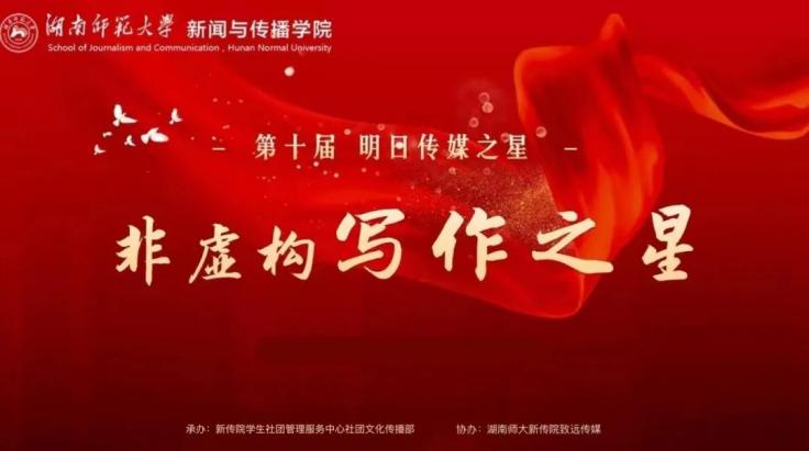 (通讯员 陈可心 易高娄 慧煜)耀青春百年,奏时代强音!5月19日晚,第十届明日传媒之星“非虚构写作之星”决赛于线上举行,新传院罗新星老师、陈艳辉老师、汤敏老师、朱费伽老师担任此项比赛的评委。非虚构写作之星由新传院学生社团管理服务中心社团文化传播部承办,致远传媒协办。