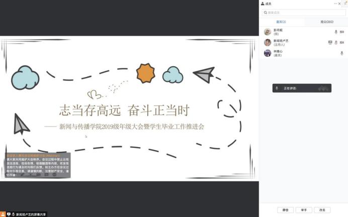(通讯员 卢艺)“开学第一课”作为深化思政铸魂育人理念的有效途径,是教育的重要环节,也是学生们每学期开学的一门必修课。为了营造良好开端,保障毕业年级工作的有效开展,9月1日下午,我院2019级召开线上年级大会暨就业工作动员会,年级辅导员林雅心、彭丹妮以及全体同学参加了此次线上会议。