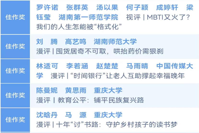 (通讯员 于蓉)为有效地促进社会信息交流和公众参与,加强互文传播和自由言论的发展,提高新闻媒体质量,建立积极的社会氛围,湖南红网新媒体集团主办了第八届全国大学生“评论之星”选拔赛。5月29日,决赛评选结果正式出炉。我院20级新实班刘腾、20级新闻班高艺鸣和19级新实班吴雨林三位同学荣获第八届全国大学生“评论之星”佳作奖和优秀奖!
