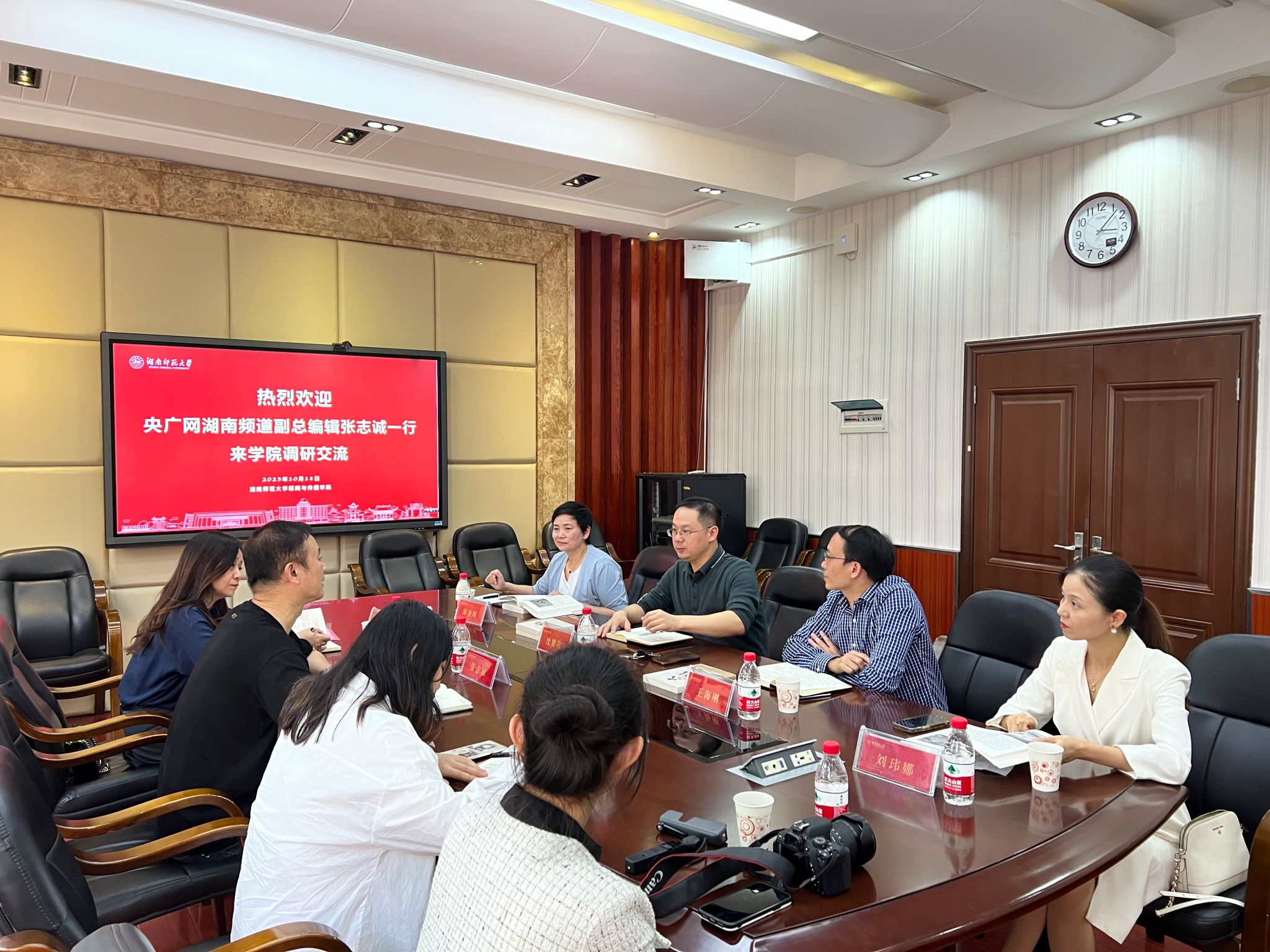 (通讯员 李冠华)2023年10月18日下午,央广网湖南频道副总编辑张志诚,办公室主任曹洁,记者黄柯岚一行来太阳集团tyc151调研交流,太阳集团tyc151党委书记沈贤岚,副院长王海刚教授,新闻学系陈艳辉副教授,播音与主持艺术系专任教师刘玮娜出席会议。