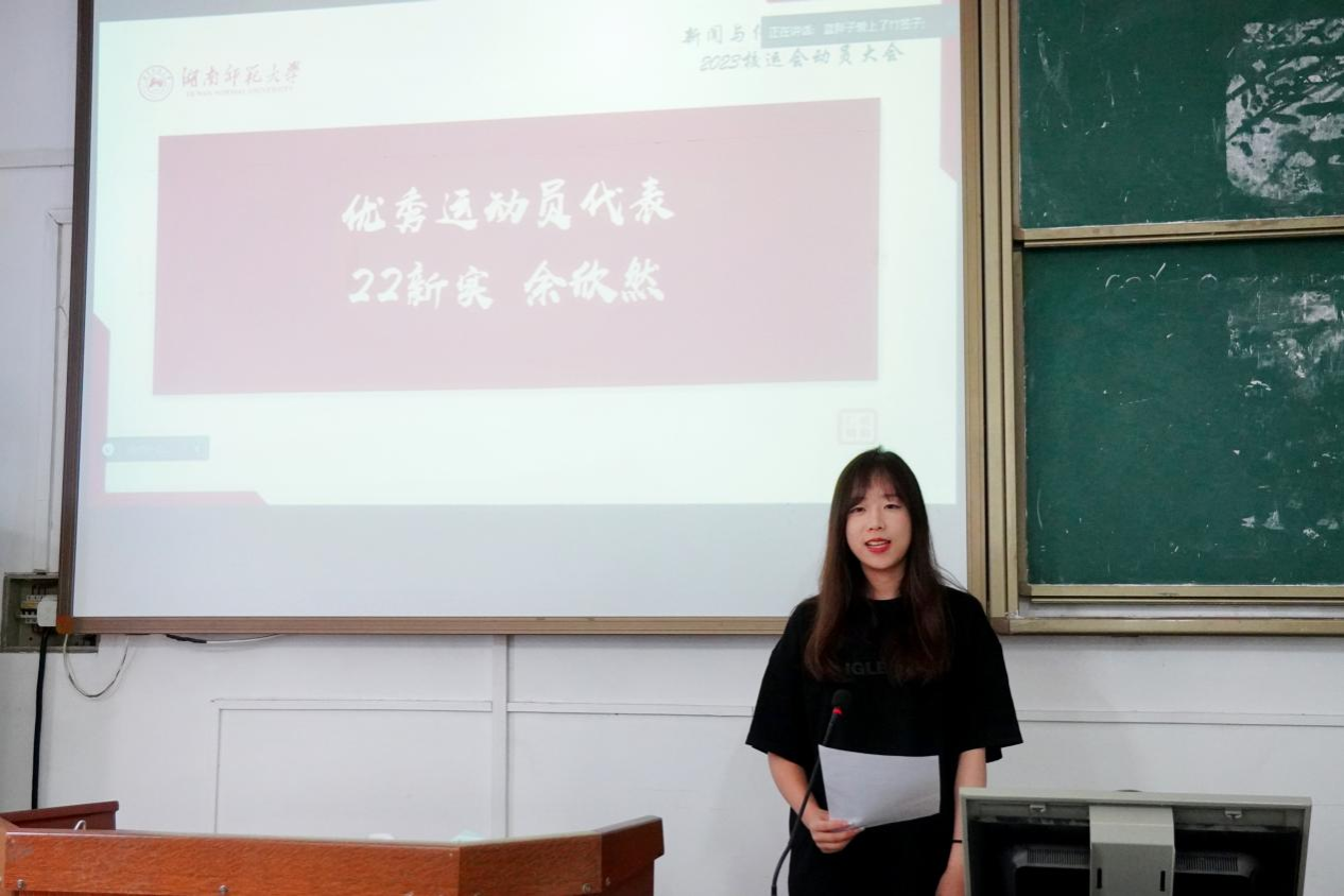 余欣然代表运动员发言,她分享了自己的比赛经历,鼓励大家发扬学院体育精神,以饱满的热情参与比赛,争取取得优异成绩。