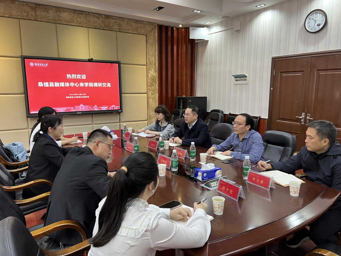 (通讯员 李冠华)为加强校地深度合作,促进理论与实践相融合,拓宽毕业生就业渠道,为融媒体新闻宣传工作注入新鲜血液,推动双方合作协议落地。10月26日上午,桑植县融媒体中心主任彭宏萍,副主任吴明波,记者陈中化、高丽文一行四人前来我院调研交流,太阳集团tyc151党委书记沈贤岚,副院长王海刚教授,方提教授,单文盛副教授参加会议。