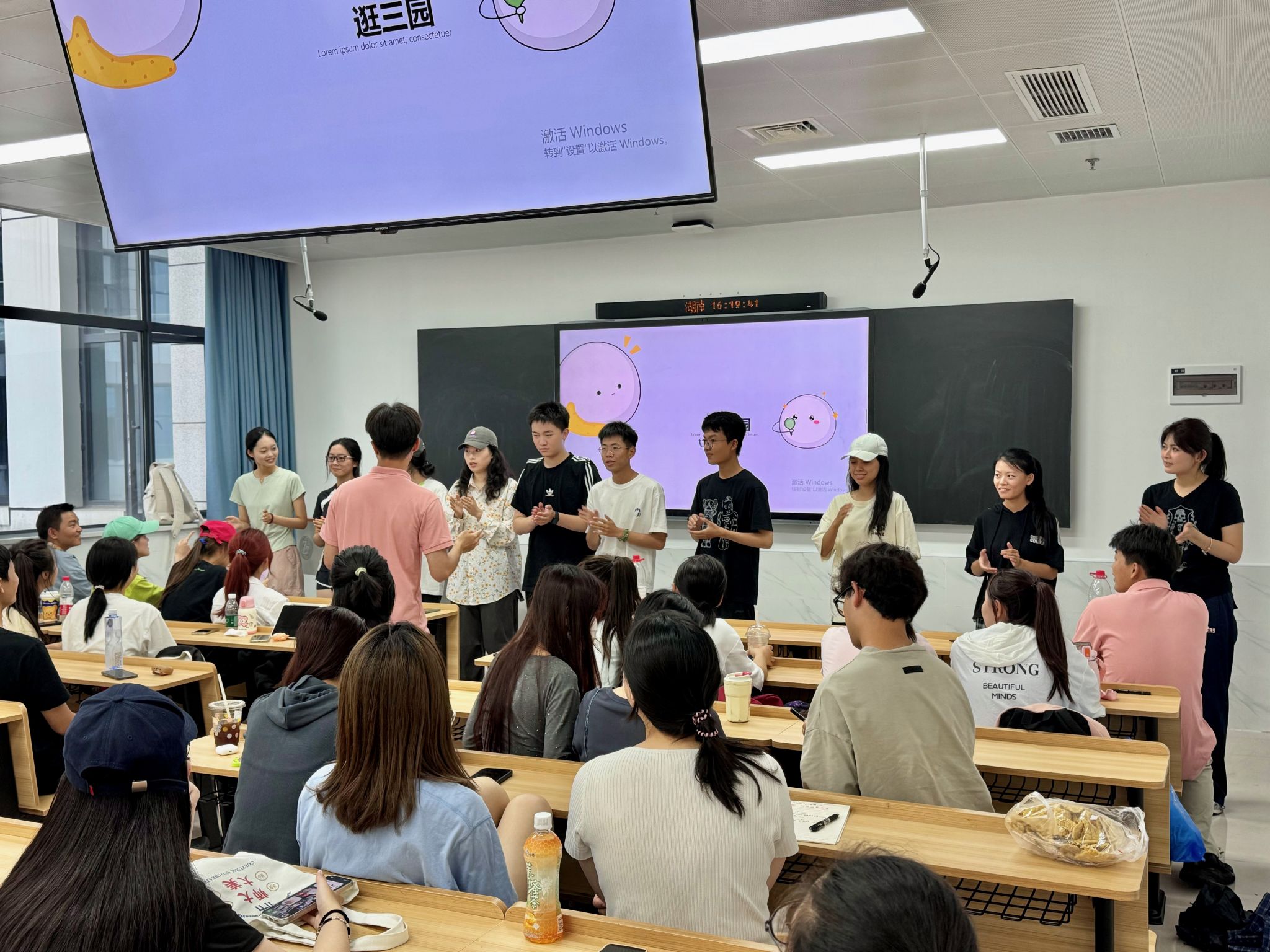 此次活动以班级为单位设置了多种游戏。方言传声要求第一位学生用地方方言翻译题目,再由参与者依次传递,最后一位用普通话回答正确则算作成功。现场的参与者配合默契,成功解密方言。同学们在模仿中体会了地方特色,拉进了彼此的心理距离;你画我猜游戏要求一方将想法转化,在黑板上绘制成图形,另一方根据图形猜成语。参与者一画一猜,进行了良性互动,增进了彼此的默契;听歌识曲吸引学生积极参与,表达想法,活跃现场气氛。活动中,参与者认真投入,观看者积极互动,现场气氛活跃。学生表示,参与这次活动让他们释放了心理压力,在集体中感受到了归属感和幸福感,更好地适应了大学生活。