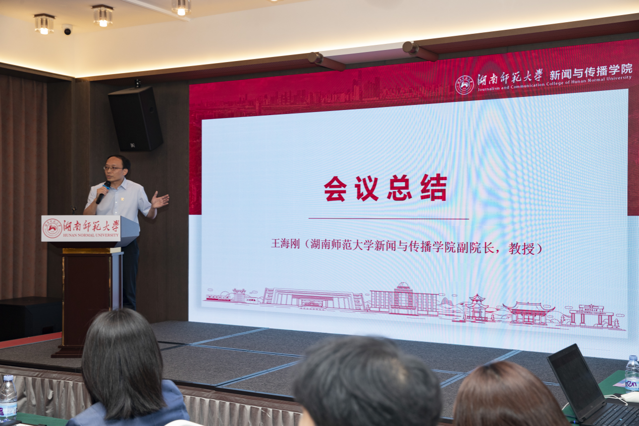 副院长王海刚教授对本次研讨会做了简要的总结,他介绍了学院新闻传播人才“1314”培养模式,期望湖南、湖北新闻传播院校之间加强交流合作,推动新闻传播教育教学改革,努力建设新闻传播学术共同体,为加快构建中国新闻传播学自主知识体系贡献智慧和力量。