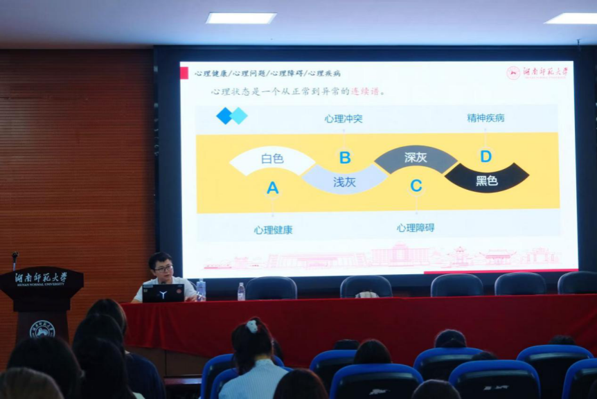 讲座伊始,卢健老师以“心理危机”为切入点,结合新生刚入校园易出现的适应问题,用通俗的语言搭建起心理健康知识的框架。他围绕“心理状态认知”“求助渠道梳理”“情绪类型划分”“合理情绪疗法应用”四个核心板块展开讲解,通过直观的图表对比、贴近校园生活的实例分析,将“情绪ABC理论”等专业名词转化为可理解、可运用的实用方法,让在场新生快速掌握情绪调节的核心逻辑。