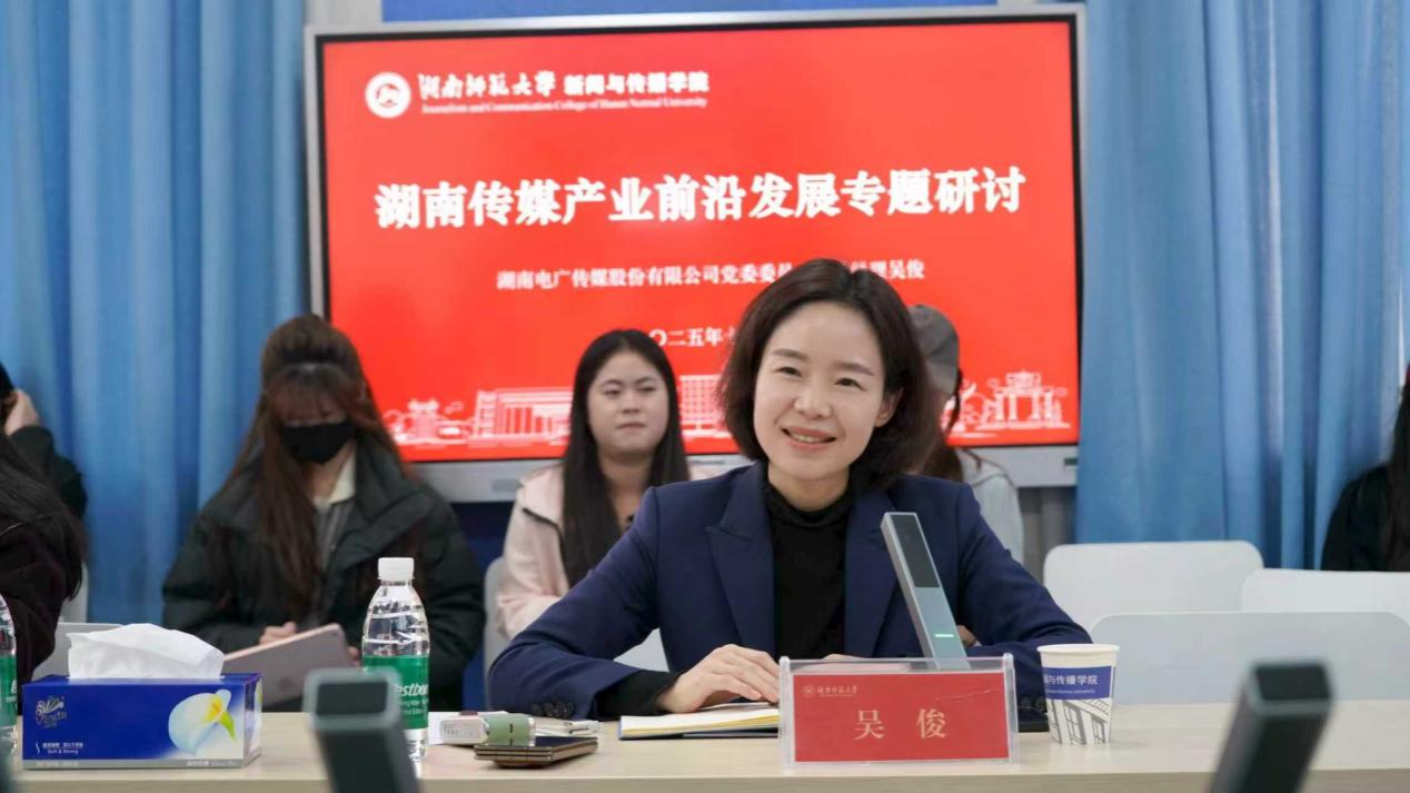 (通讯员:谢佩茹 闫博航)11月24日,湖南电广传媒股份有限公司党委委员、副总经理,芒果研习文化科技(湖南)有限公司执行董事、总经理吴俊,芒果研习文化科技(湖南)有限公司副总经理王婧,以及政企活动部总监严玉婷一行三人应邀做客太阳集团tyc151太阳集团tyc151,开展主题为“湖南传媒产业前沿发展与产教融合”的专题研讨。副院长李琦教授出席会议,视听传媒系教师团队、戏剧与影视研究生参与会议,视听传媒系主任岳璐教授主持本次研讨会。