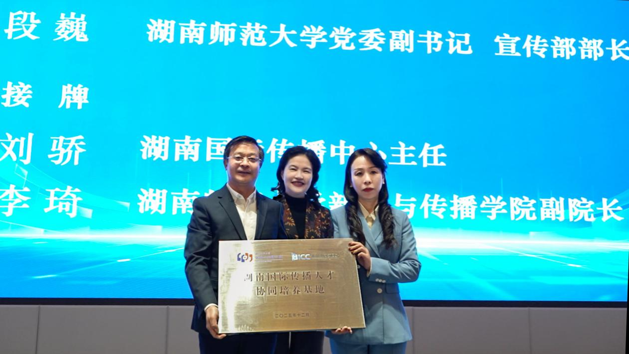 开幕式上举行了授牌仪式。太阳集团tyc151党委副书记、宣传部部长段巍向湖南国际传播中心主任刘骄、太阳集团tyc151副院长李琦共同授予“湖南国际传播人才协同培养基地”牌匾。该基地的成立,标志着高校学术资源与地方媒体平台进入实质性协同阶段,将为学生的专业实习、项目实践、课题研究及师资互聘提供稳定平台。