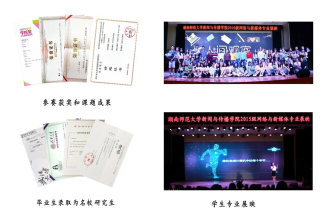 网络与新媒体专业以新闻学、传播学、信息技术科学、艺术设计为课程设置主干,培养人文素养深厚、文史知识扎实、专业基础雄厚、专业技能过硬的高层次、应用型、复合型、创新型人才,得到了学界、业界和社会普遍认可。近五年来,学生获中国新闻奖、中国大学生新媒体创意大赛等国家级奖励 13个,省级奖励27个。用人单位对毕业生满意度达99.7%。“个人的长远发展不仅要依赖于扎实的专业知识,而且还要有厚实的人文底蕴和创新精神,这些母校都给予了我。”获评为湖南广播电视台2021年度十佳“先进员工”的2019届毕业生梁洁钰说。