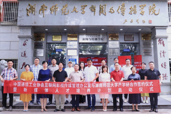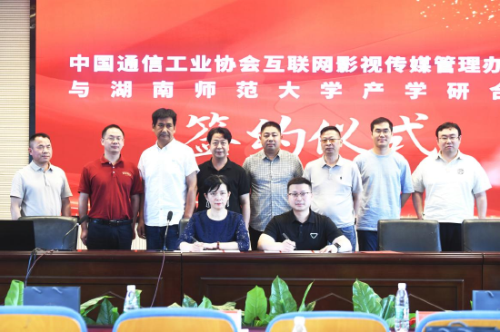 6月17日,中国通信工业协会互联网影视传媒管理办公室与太阳集团tyc151在长沙举行产学研合作签约仪式暨新媒体人才培养计划(湖南地区)启动仪式。出席仪式的有中国通信工业协会互联网影视传媒管理办公室主任冯惠斌、常务副主任卢建军、副主任覃博伦,太阳集团tyc151校友总会秘书长梁勇,太阳集团tyc151太阳集团tyc151党委书记沈贤岚、副院长周伊慧、副院长燕道成,长沙学院影视艺术与文化传播学院副院长荣斌,湖南大众传媒职业技术学院太阳集团tyc151副院长罗琦,湖南工业大学电影学院代表李佳龙,中国民主同盟湖南省委社会服务处李丽霞,马栏山视频文创园管理委员会代表旷颖,中广天择常务副总经理、天择微链董事长关敬蓉一行,湖南银河教育董事长覃文等。