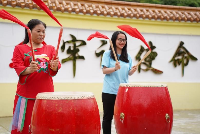 汇演结束后,中外实践团成员、越南留学生范氏芳草与阮芳蓉向村民请教了号子的喊法以及基本鼓点打法。阮芳蓉表示:“民俗文化丰富了人们的生活,通过民俗文化我们能更好地了解不同的国家,同时促进中外文化交流。”