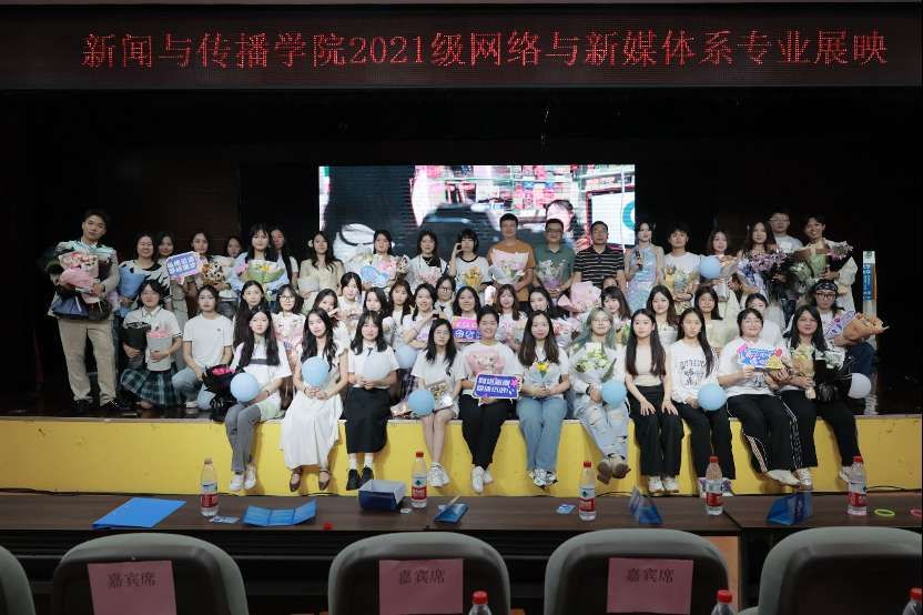 汇游,从五湖四海而来;洄游,往新的领域进发。专业展映晚会以“洄游”为主题,讲述了2021级网络与新媒体专业的50名同学携着梦想汇集在一起,又带着各自的希望洄游到属于自己的那片湛蓝海域的故事。晚会分“洄游”“汇游”“会友”“再见,再洄游”四个篇章进行作品展演,并结合歌舞、抽奖等活动为现场观众带来了一场绝佳的视听盛宴,也全方位展现了网络与新媒体专业学生情技糅合的专业素养。而且,新媒体学子们发挥专业特长,在此次晚会前期准备中积极开展融媒体运营,以微信公众号、微博、小红书等搭建新媒体矩阵,全面策划宣传,受到广泛关注;同时,在展映中通过视频号等平台进行同步直播,获得数千人次观看。