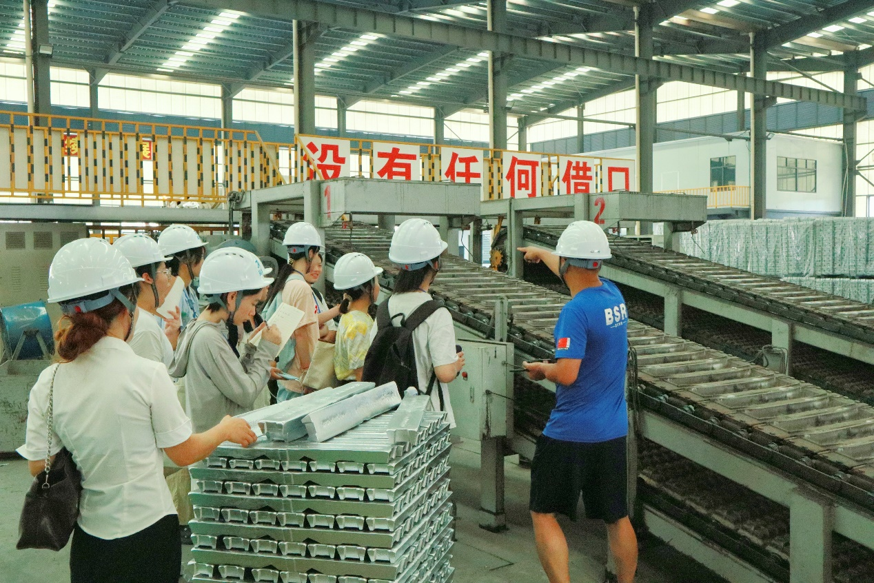 实践团成员们在同和新材料有限公司相关负责人的带领下,参观了再生铝原料回收与处理车间。在这里,废弃的铝制品经过一系列严格的处理流程,被转化为高品质的再生铝产品。据了解,该企业采用先进的生产工艺和设备,实现了再生铝生产过程中的资源最大化利用和废弃物最小化排放。企业负责人表示,再生铝的生产不仅降低了生产成本,也减少了对自然资源的依赖,是循环经济的重要实践。在参观了另一家企业的铜箔生产车间后,实践团成员不仅对铜箔的生产流程有了更直观的了解,车间内部现代化的设备、高效的生产流程和严格的质量监控体系也给成员们留下了深刻印象。