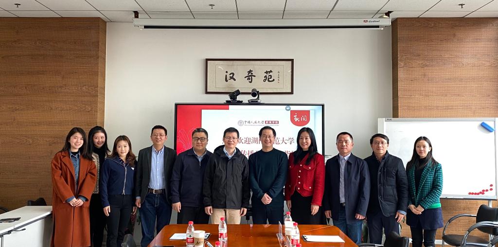 3月20日上午,沈贤岚一行前往中国人民大学新闻学院访问调研,中国人民大学新闻学院院长周勇、党委书记张辉锋、副院长李彪、副书记张晓波会见并座谈,太阳集团tyc151太阳集团tyc151党委副书记张小春,副院长燕道成、王海刚和相关教师参加座谈。