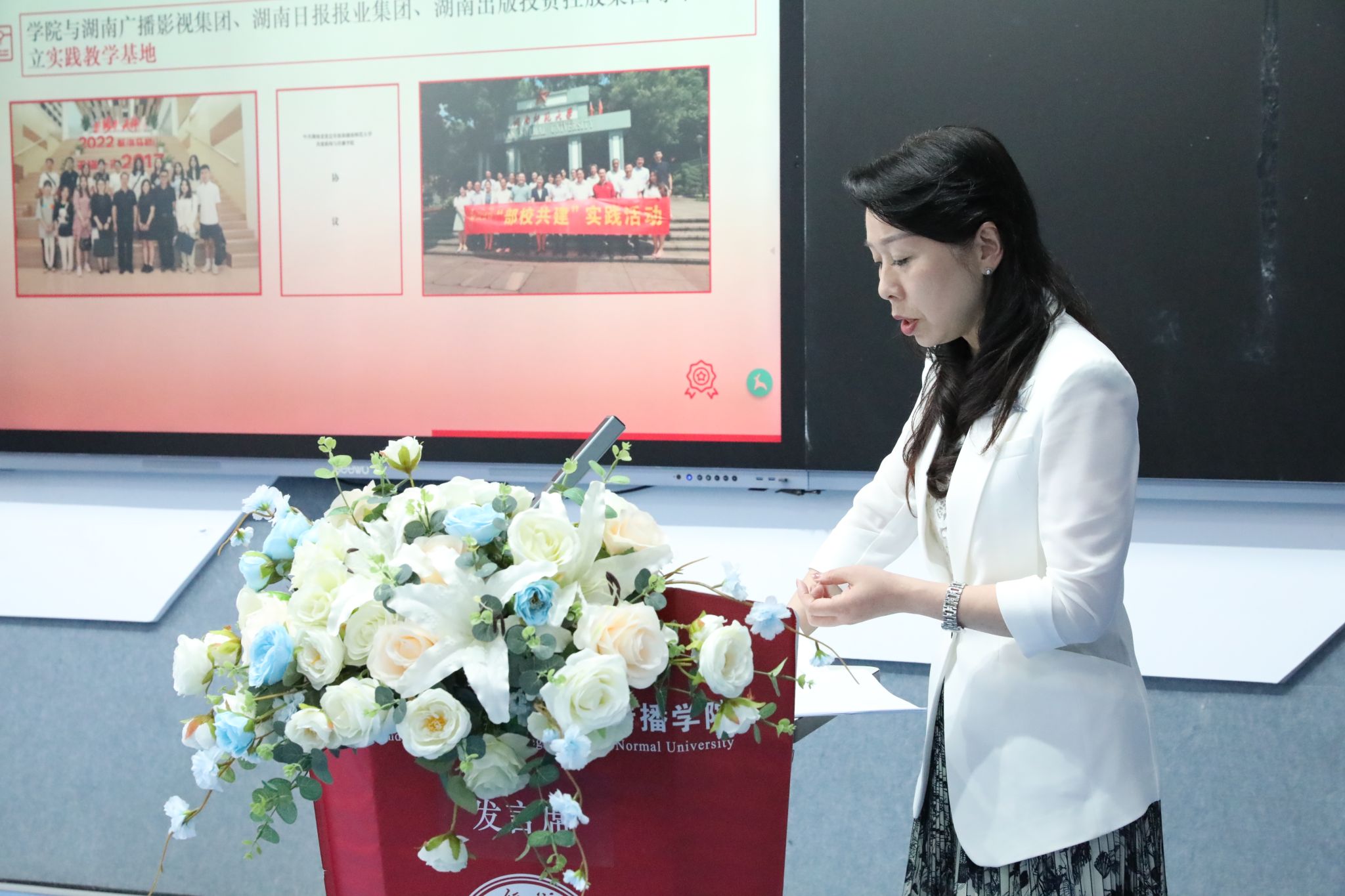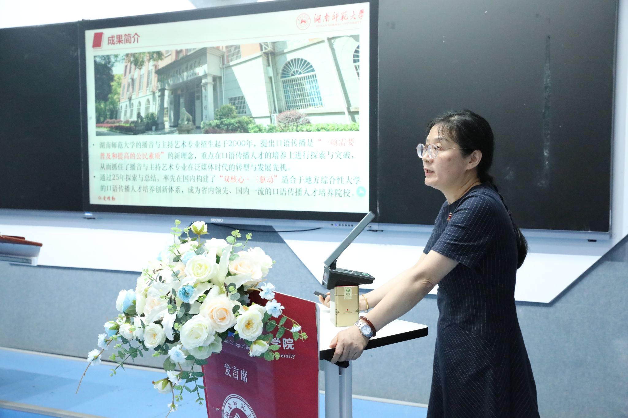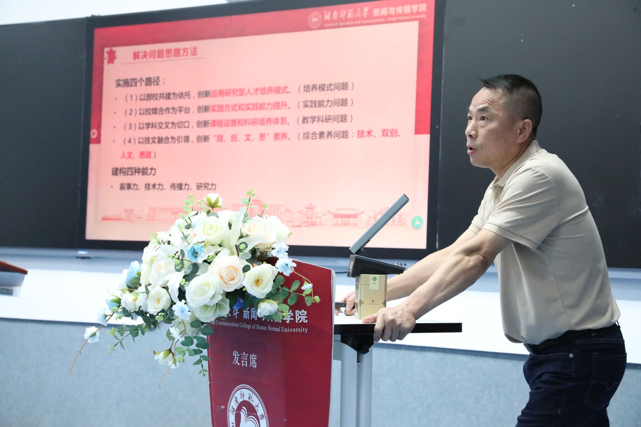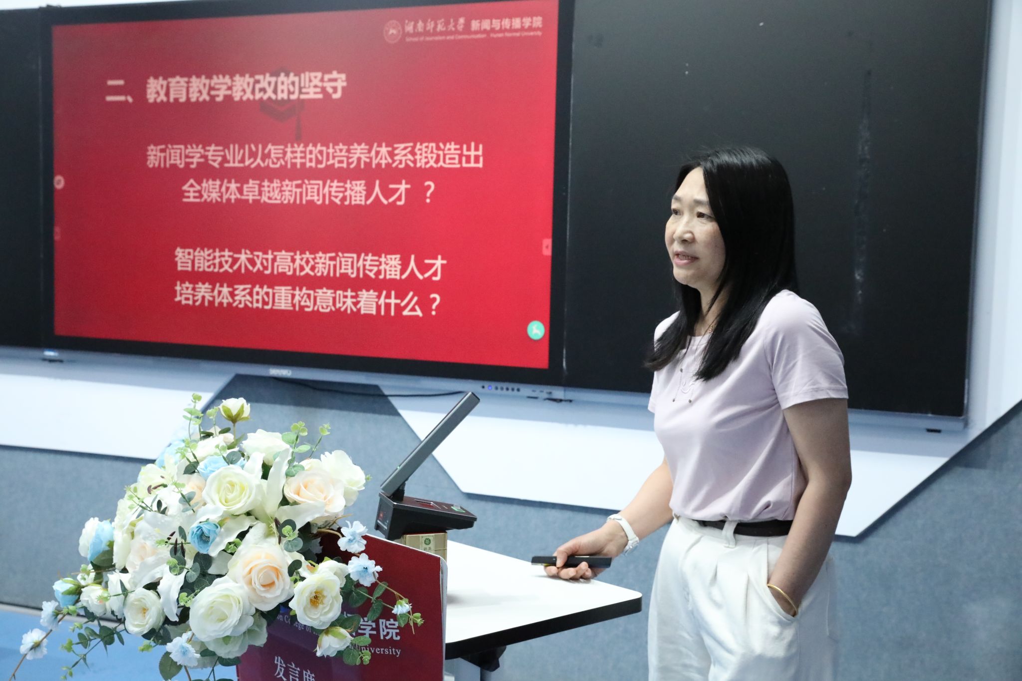 申报负责人依次围绕成果展开汇报,重点阐述了成果研究的背景、亟待解决的教学问题、创新解决路径、实际育人成效及核心创新点。汇报内容紧密结合新闻传播学科特色,涵盖人才培养模式创新、课程体系优化、实践教学改革等多个维度,充分展现了学院在教学实践中对行业需求响应、学生能力提升的探索与突破。