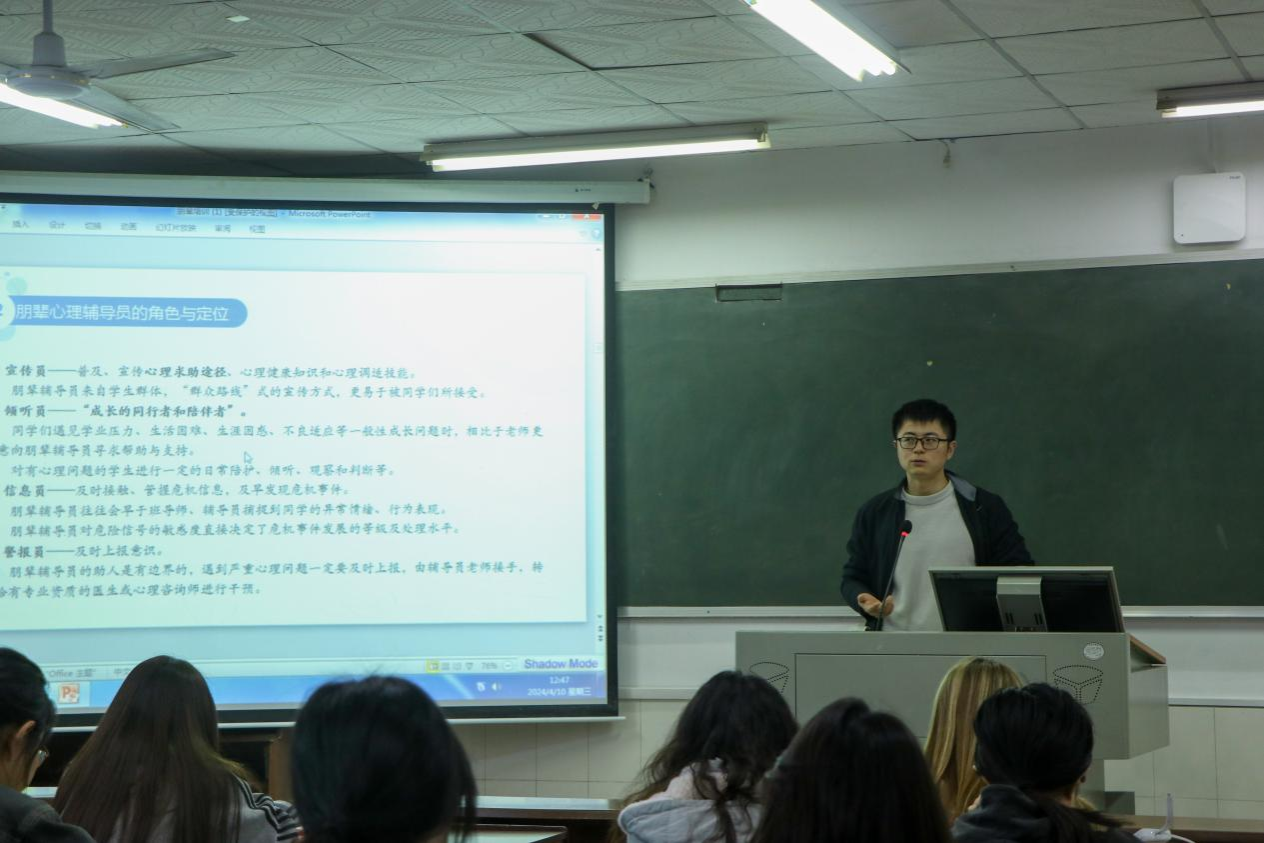 (通讯员何一苇)4月10日中午,我院在张公岭校区综合楼602教室召开2023级朋辈心理辅导员培训会。本次培训会邀请心理中心卢健老师进行讲解,2023级辅导员杨湘怡及2023级全体心理委员、朋辈心理辅导员出席培训会。