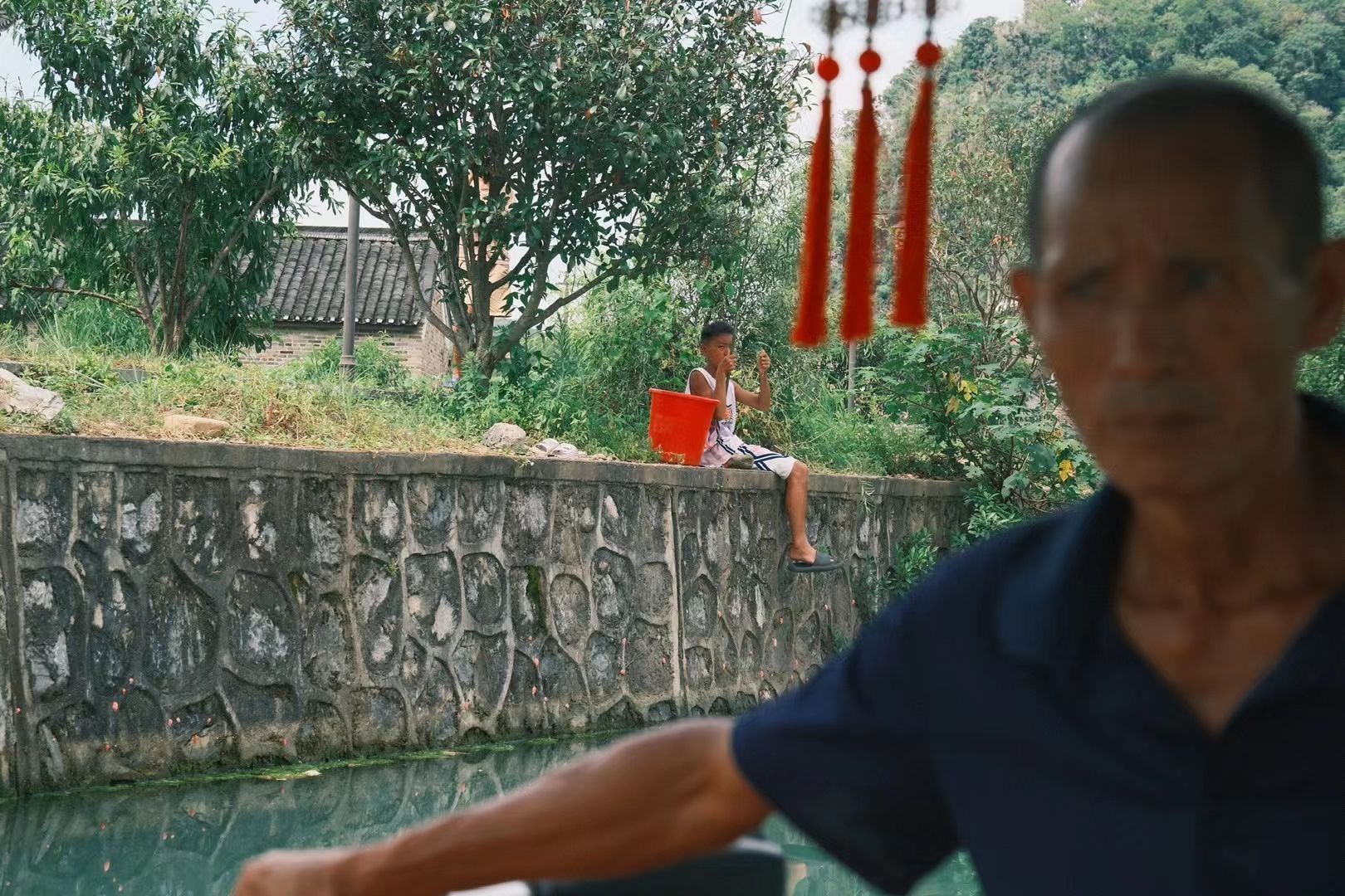 上甘棠村为游客撑船的老人和河岸上的小朋友。