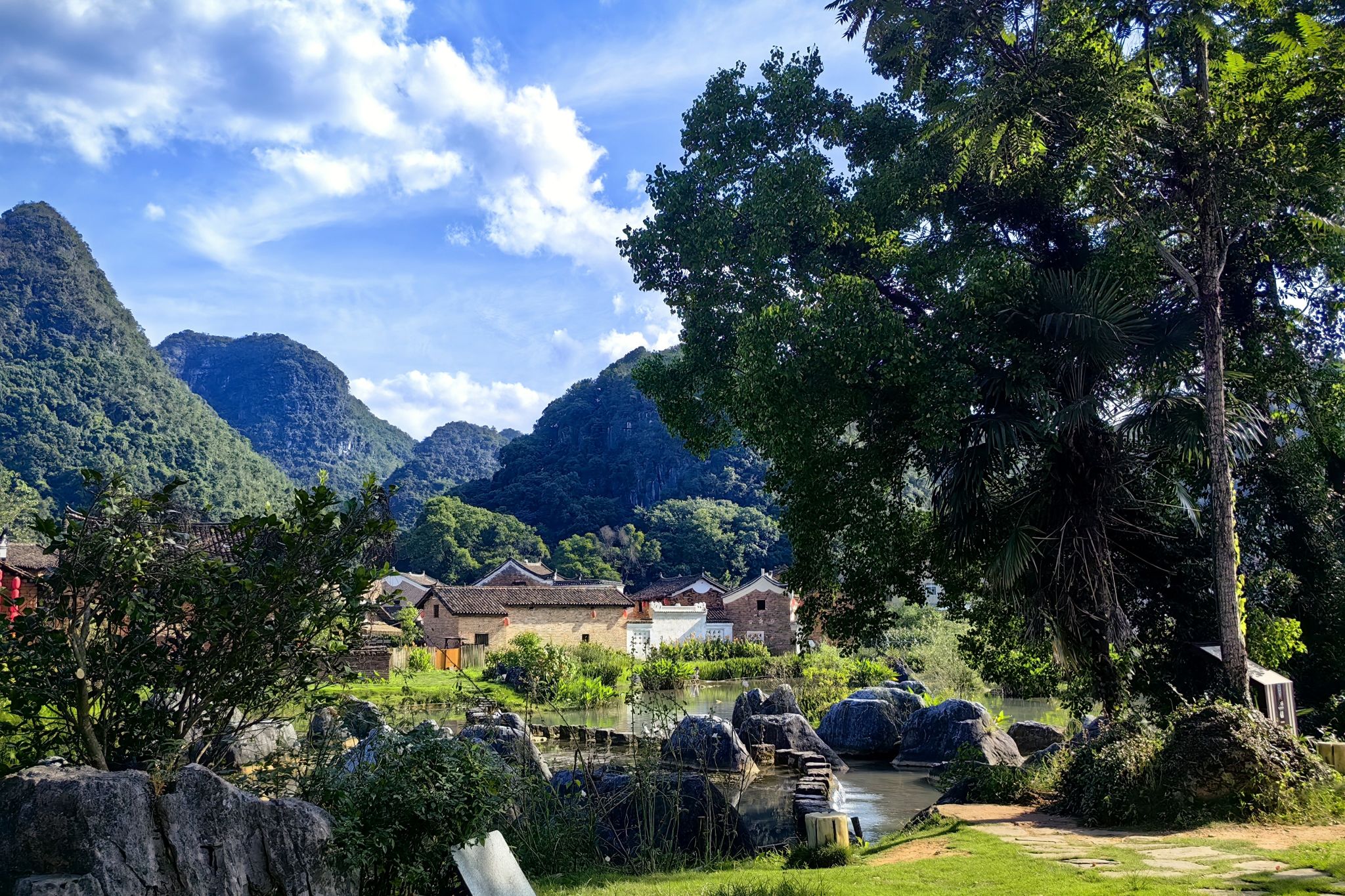 勾蓝瑶寨依山傍水,特色建筑与自然风光相映成趣。