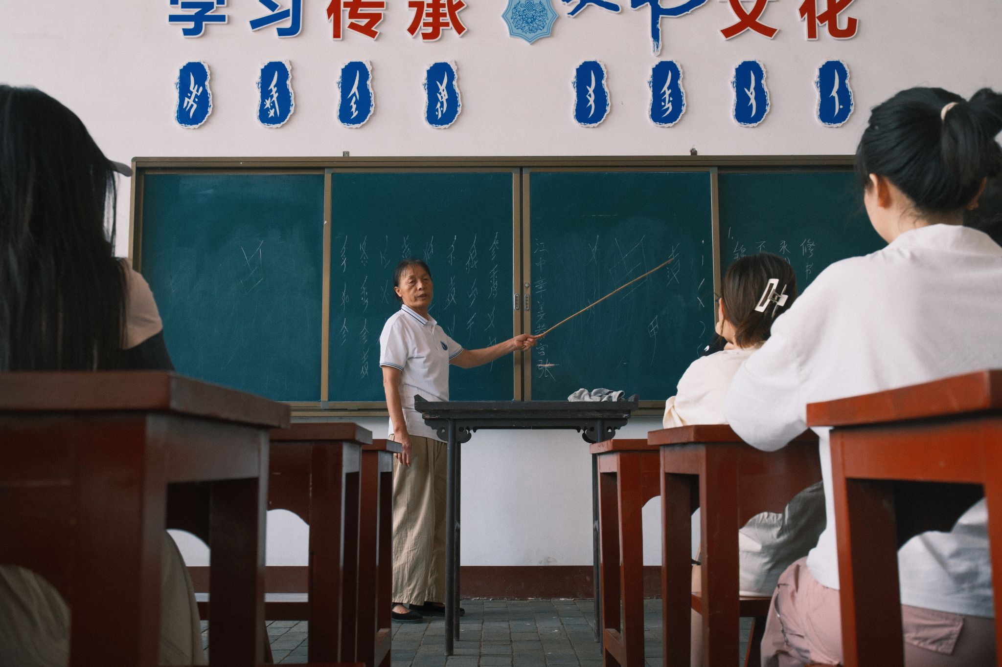 女书非物质文化遗产传承人胡美月,多年来为推动女书的保护与发展做出了突出贡献。在女书园的女书学堂,胡美月给实践团成员们上了一堂女书入门课。