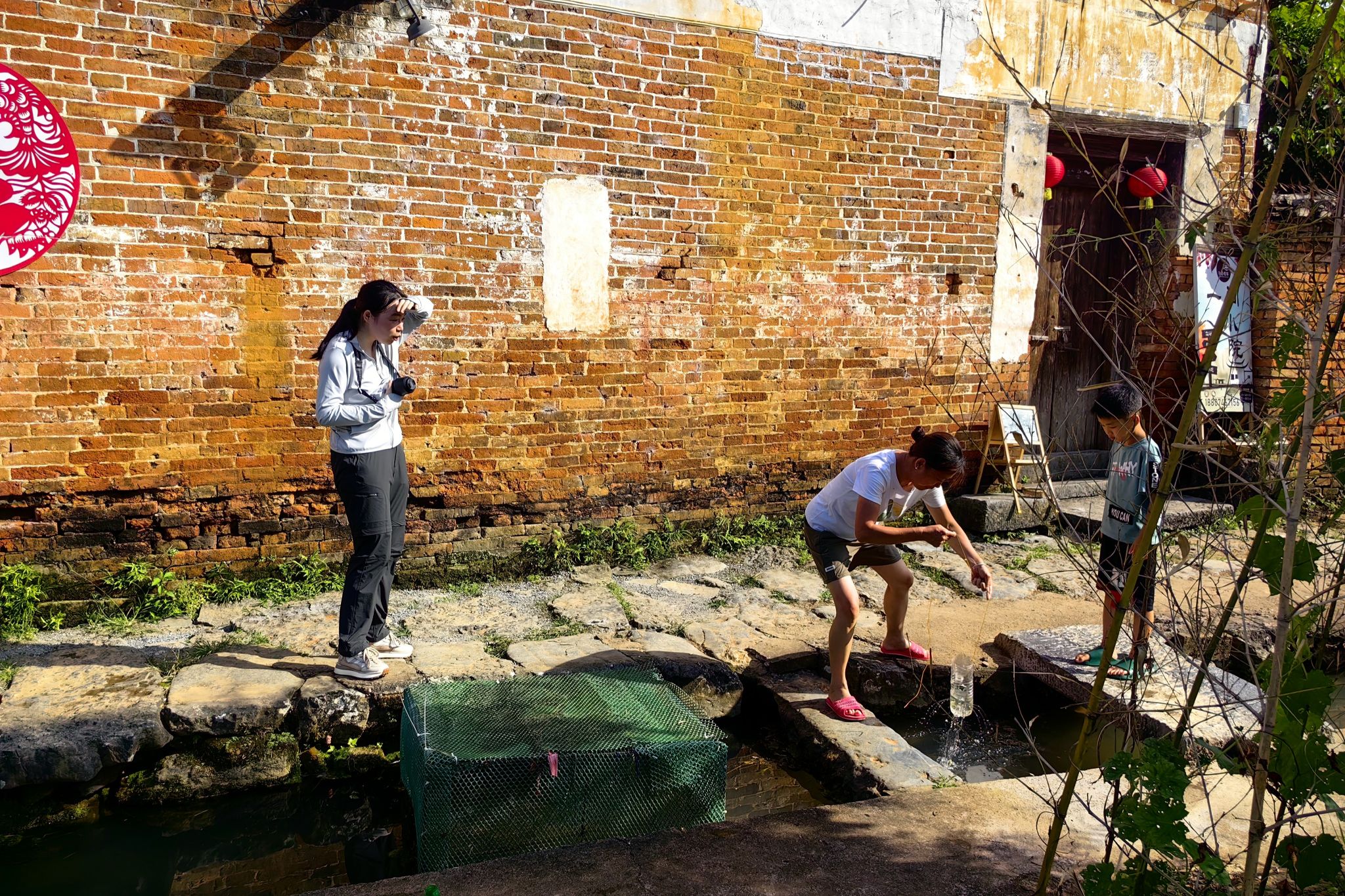 勾蓝瑶寨环境优美,流水穿过村落。一对母子正在用简易器具捞小鱼,实践团成员与他们进行了交谈。