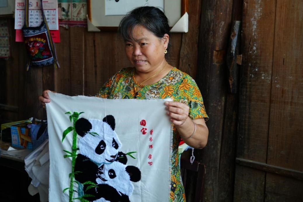 曾冬娇展示插绣作品