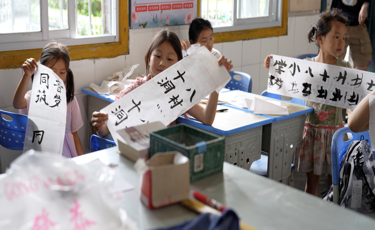 在团队成员的指导和鼓励下,孩子们纷纷拿起毛笔练习,在掌握了基础汉字的书写要领后,完成了写有“十八洞村”的系列书法作品。“同祖同根,同身同心,同讲普通话,同传中国情。”书法作为中国传统文化的重要组成部分,是一种文化传承和表达的方式。本次公益课堂的开展不仅提升了孩子们的普通话素养,更通过艺术的形式增强了他们对家乡的认同感,在感受汉字魅力的同时书写对家乡的热爱。