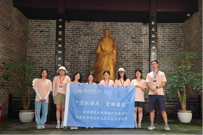 实践团成员和俄罗斯博士生在屈原像前合影