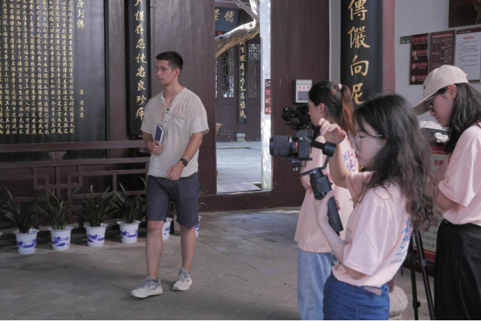 下午,实践团成员在屈子祠开展“中外对话”主题拍摄活动。主持人身着汉服,在镜头前为俄罗斯博士生讲解屈原文化,留学生在主持人的讲解下理解了屈原清廉高尚的品质。主持人和留学生的互动推动了屈原文化走向世界,促进国际文化交流。