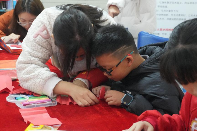 志愿者带领孩子们用卡纸制作互助爱心卡片,绘制“志愿者”主题画,制作志愿者奖章。创意手工不仅加深了孩子们对志愿精神的理解,也吸引了家长们的注意,不少家长加入了手工大队,现场既有活力也有温馨。