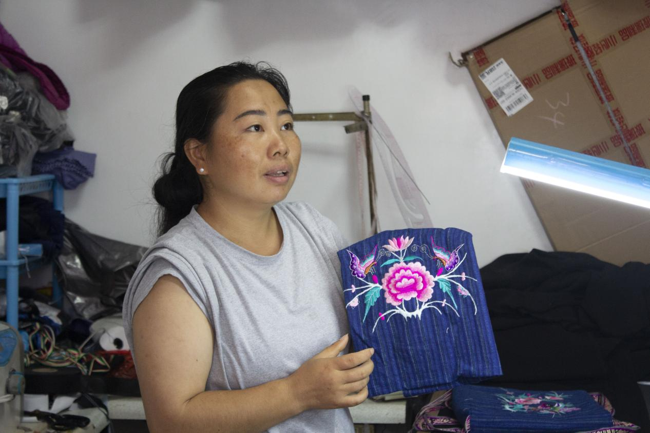 实践团成员来到国茶村集市,走进一家苗绣店铺对店主进行深入采访。店主详细介绍了苗绣的历史渊源、图案寓意和刺绣技法。苗绣作为苗族文化的重要载体,其纹样涵盖自然万物与神话传说,每一针每一线都蕴含着苗族人民对美好生活的向往与独特的审美观念。在店主的讲解下,成员们对苗绣的文化价值有了更清晰的认识。随后,实践团成员试穿苗族传统服饰,亲身体验苗绣工艺。在店主的指导下,成员们拿起绣针,尝试简单的刺绣针法,感受苗绣制作的精细与不易。通过实践,成员们表示,不仅看到了苗绣的精美,也看到了非遗传承人的坚守与付出。