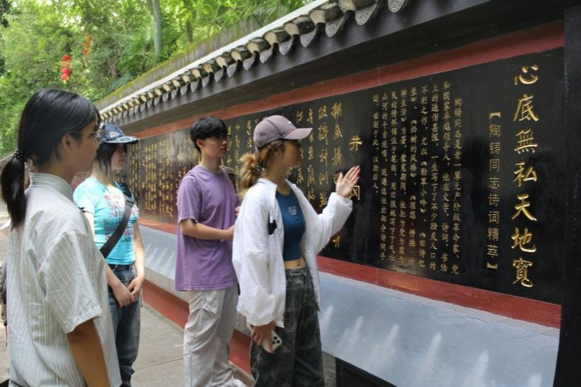 活动伊始,实践团全体成员在陶铸像前合影,随后在工作人员的带领下走进纪念馆。该馆陈列了珍贵的文献资料和实物展品,生动再现了陶铸同志波澜壮阔的革命生涯和为党为民无私奉献的一生。参观过程中,讲解员讲述了陶铸同志在革命斗争中的种种故事,如“三不吃规定”“清廉拒礼”“故居让位水库”。他坚定的革命意志,崇高的政治精神,清廉的作风和无私奉献的品质,深深感动了实践团每一位成员。参观完毕后,实践团成员还结合新闻传播专业所长,精心拍摄制作了以陶铸精神为主题的红色小短片,通过镜头语言生动诠释革命先辈的风范。大家与讲解员交流心得体会,纷纷表示要继承老一辈无产阶级革命家的精神,以先辈为榜样,为党和人民的事业贡献力量。