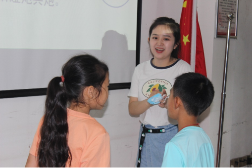 图为团队成员教导孩子们用标准普通话说出新认识的朋友的名字。葛嘉竹摄