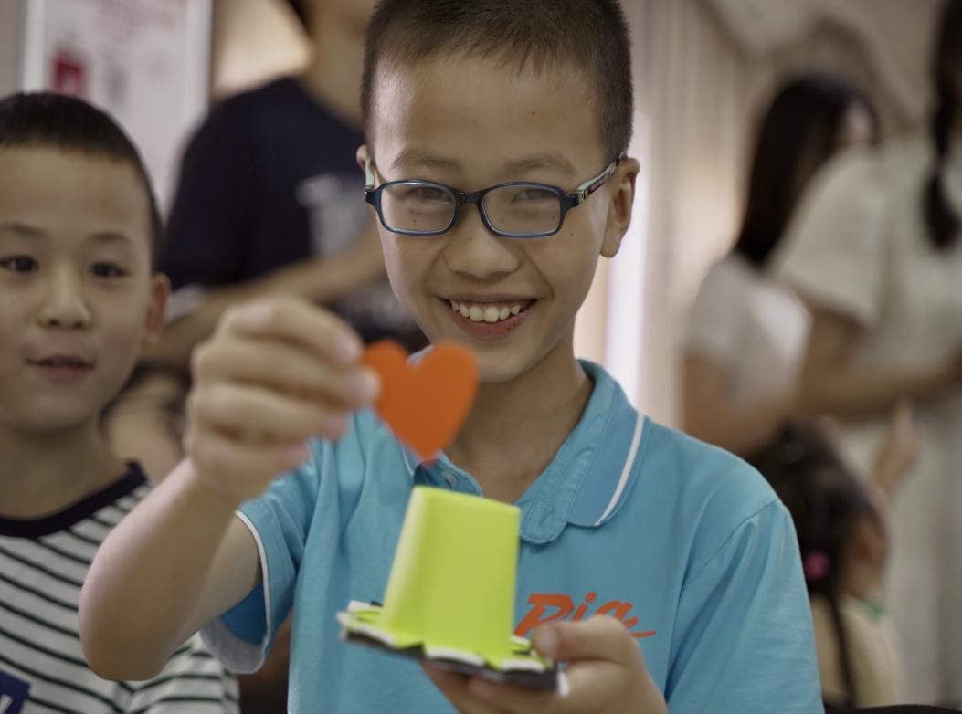 图为孩子们展示自己的手工成果。