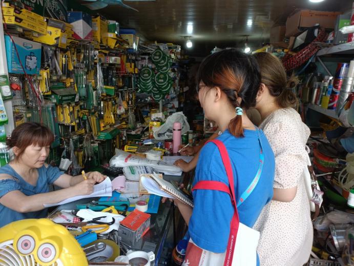 (图为“新风小分队”部分成员与商户进行交谈)