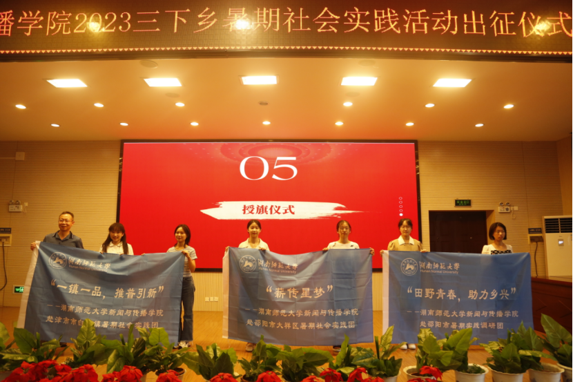 最后,举行2023年新传院暑期社会实践活动授旗仪式。新传院院领导和各指导老师为三下乡各个团队授旗,并勉励他们不断奋进,展现新传学子的风采。