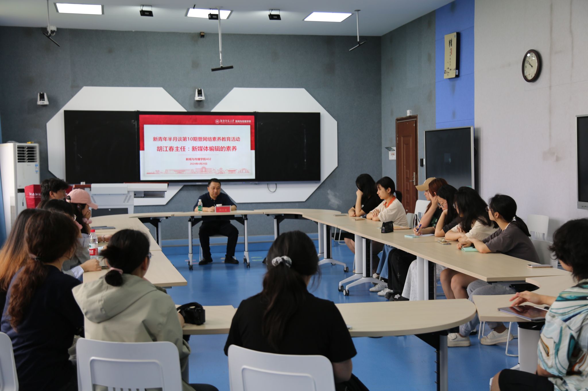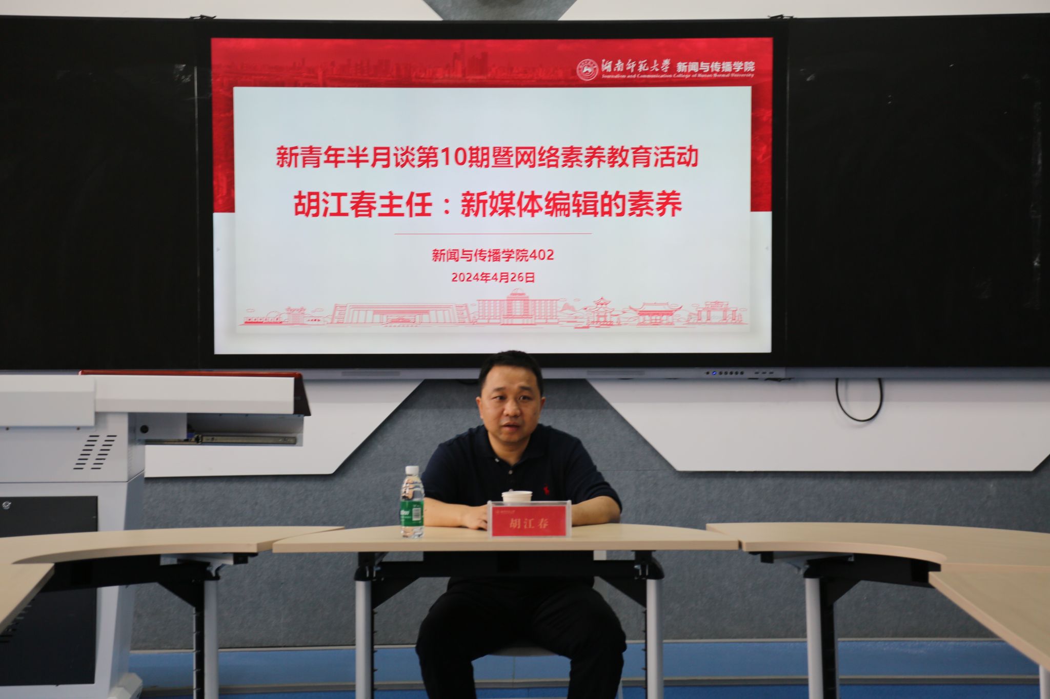 (通讯员 张天爱 李紫苜)4月26日,新青年半月谈第10期暨网络素养教育系列活动如期举行,本期特别邀请了红网新媒体集团编委、舆情中心(红网智库)主任胡江春,与在场的同学们分享新媒体编辑的专业素养以及他对于新闻宣传和舆论监督的独到见解。