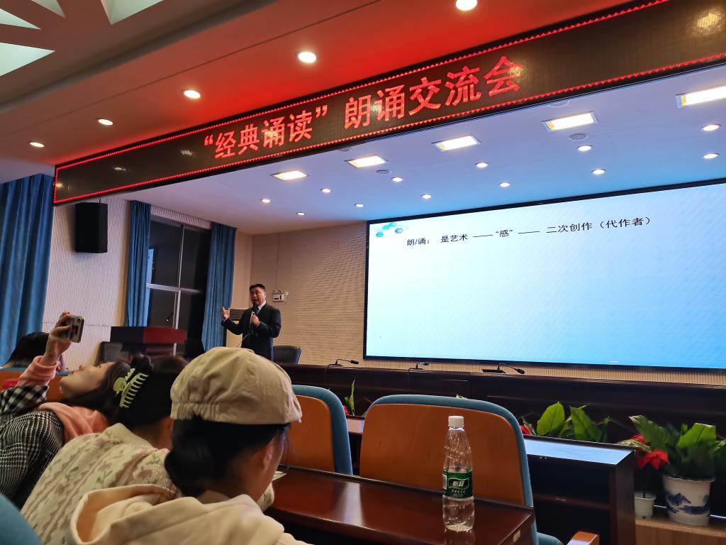 高广安老师首先向同学们提问:如何评判好的朗诵,朗诵的好坏与否有无标准?随后在同学们的抢答声中,高广安老师给出了答案:让观众听懂、听好、听嗨。这也反向给我们的朗诵者提出了要求——字正腔圆也要绘声绘色,感情充沛更需真实自然。只有让听众沉浸其中,才是二次创作者的“真本事”。“语感是好创作的基础。”高广安老师总结,朗诵需要“清、正、连”。声音要清晰、响度适当,归音字字清。字正也要意正,既要抓好声韵调,也要注重表达与理解,具有流动感。拥有好的语感,才能为情感表达铺路架桥。高广安老师列举出了一些耳熟能详的古诗中模棱两可的多音字,与同学们探讨如何选择正确的读音。他给出建议:“古人古读,今人今读,以本为本”以教材注音为标准,结合时代,不跳脱于时空,才能让观众有浑然天成之感。