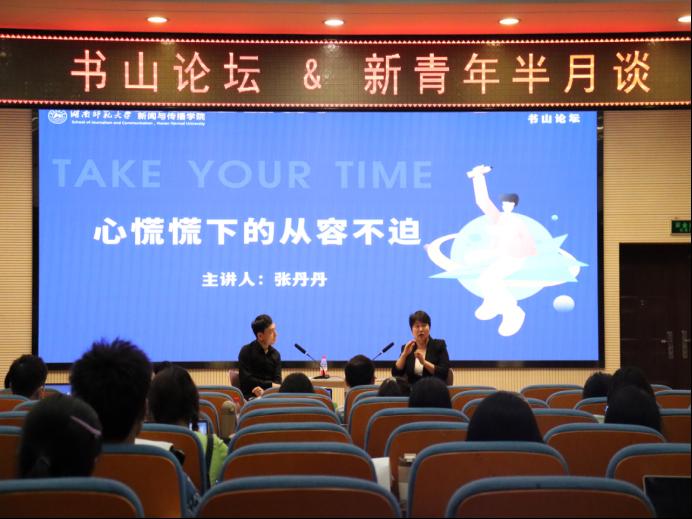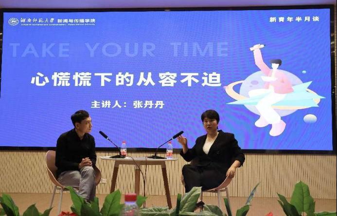 活动伊始,张丹丹就主题为什么叫“心慌慌下的从容不迫”进行了解答。在她看来,年轻人处于迷茫的时期,不能盲目跟风。她认为,时代需要人才,因此年轻人并不缺少机会,但前提是要有足够的实力,而这种实力来自于可抵岁月漫长一路艰辛的热爱。其后,张丹丹在被问到“新媒体形势下,播音生就业何去何从?”时,她提到在就业问题上,更需要关注的是“在时代千变万化下,如何发掘并坚持热爱?”她希望青年传媒学子真正理解播音主持专业的本质内容,提到这个专业需要的不再仅是标准的普通话,更多的是如何敏锐地与人沟通,了解受众的需求等。同时,她给我院学子提出建议:第一要与时代对话,以“变”应万变,不断学习,丰富自我、自我革新,跟上时代的脚步;第二要与自己对话,以“不变”应万变,对自己有清晰的认知,保持初心、坚持不懈;第三对新的传播形态工具要敏感,懂得观察生活,感受时代的变化,静心寻找这个时代的根本需求。