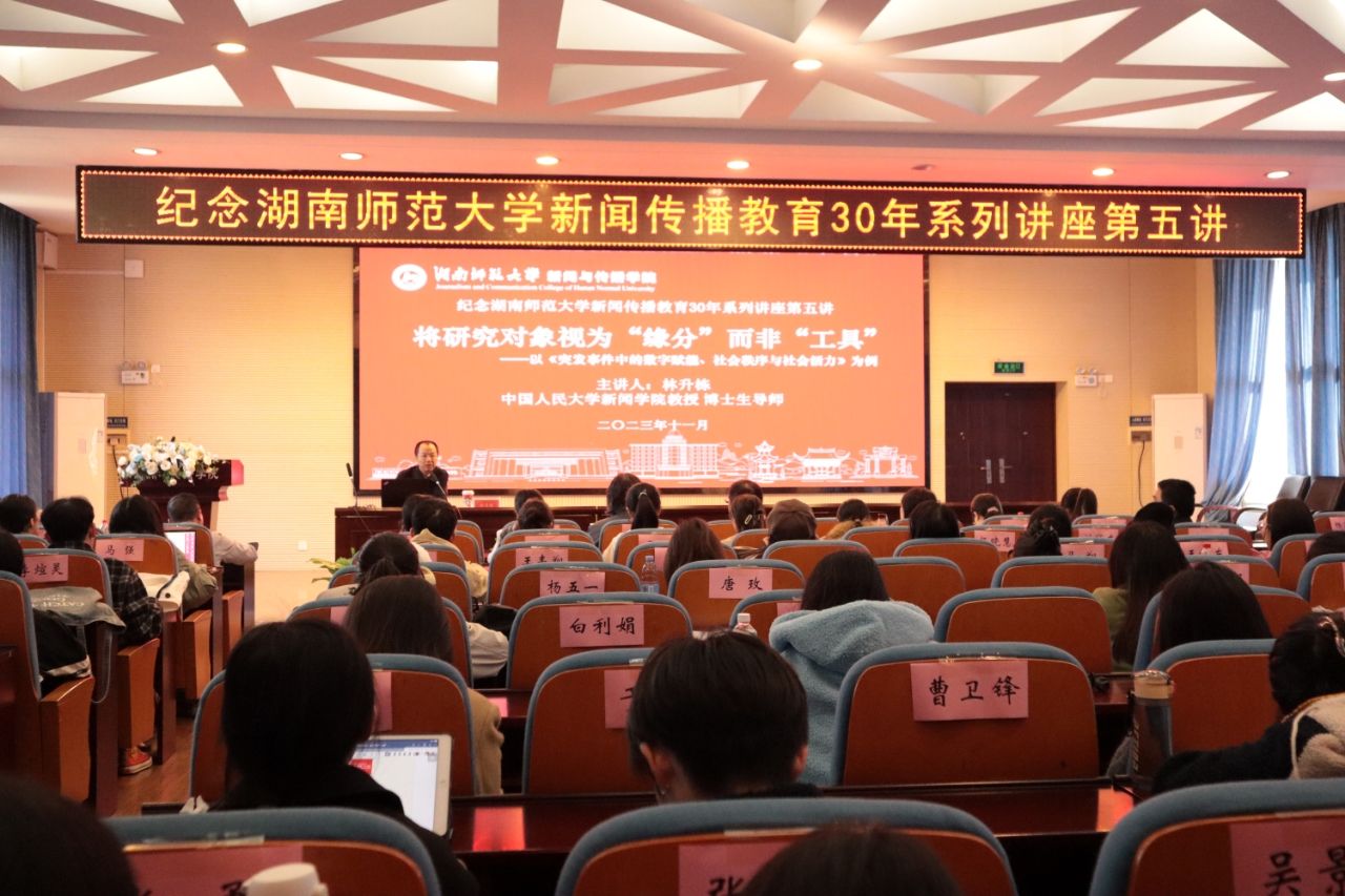 (通讯员陈梓楠,刘媛)11月15日上午,纪念太阳集团tyc151新闻传播教育30年系列讲座第五讲在书山论坛举行。中国人民大学新闻学院博士生导师林升栋教授应邀为学院师生做了题为“将研究对象视为“缘分”而非“工具”——以《突发事件中的数字赋能、社会秩序与社会活力》为例”的精彩学术报告。讲座由学院副院长燕道成教授主持,院党委书记沈贤岚与来自各系的多位教师和逾百名学生现场聆听了本次学术分享。