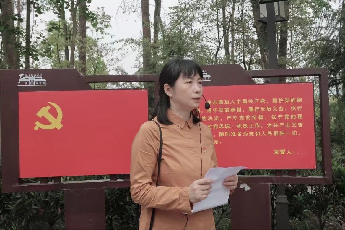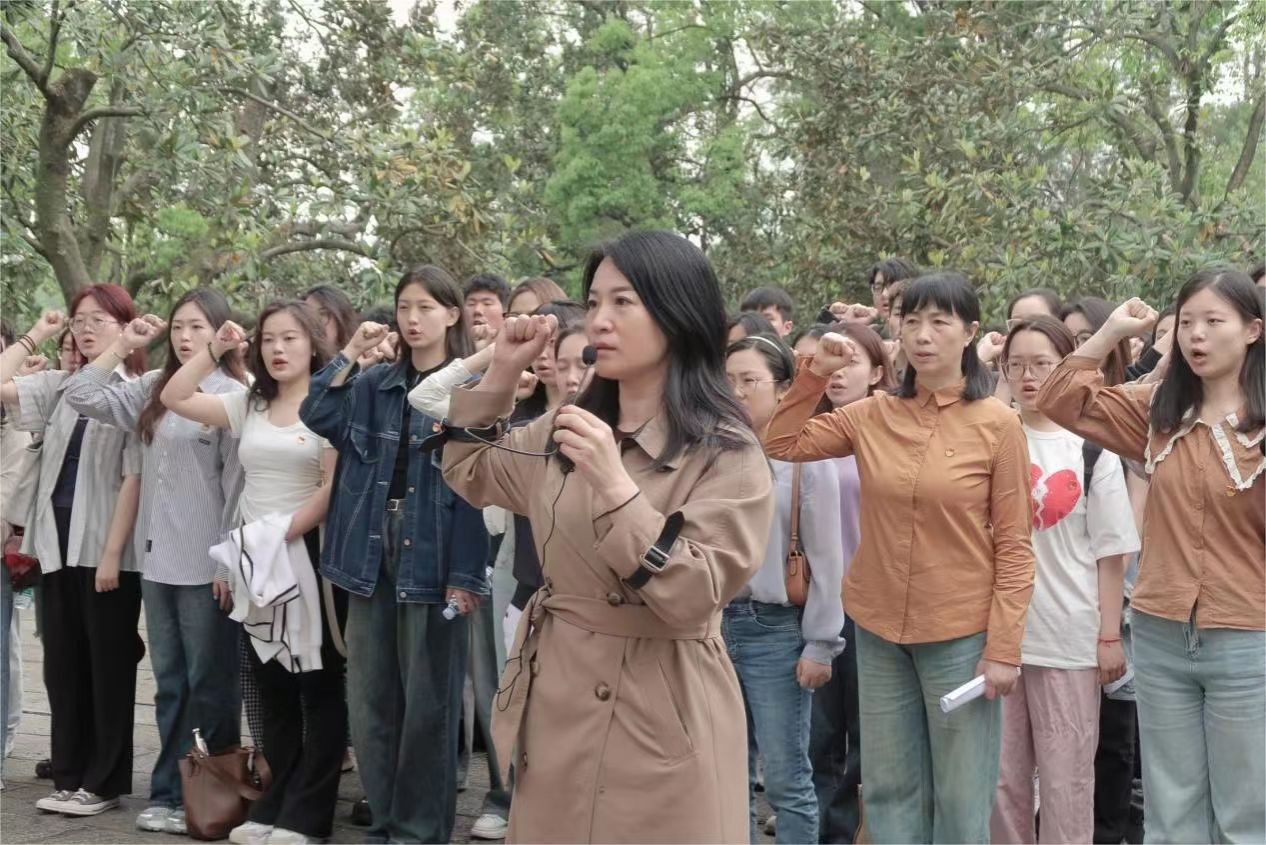 在杨开慧烈士陵园,本科生第三党支部第一书记欧阳丹玲宣读参加入党宣誓的53名预备党员名单,张小春领读誓词,全体党员面对党旗,庄严宣誓。